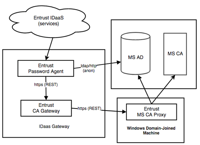Microsoft CA Proxy Server—The interfacing component that communicates to the Microsoft CA. This component must be deployed on a domain-joined machine in the same domain as the Microsoft CA.