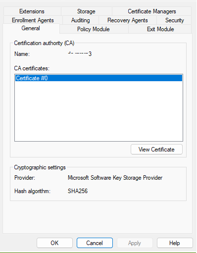 Right-click the Certification Authority and select Properties. The CA Properties dialog box appears.