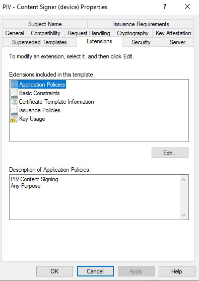 Click OK to close the Properties dialog box. The PIV - PIV Content Signer certificate template is added to the list of templates.