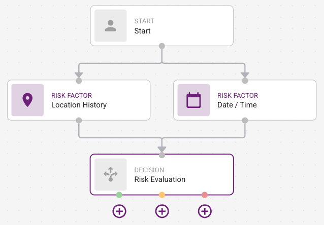 The Risk Evaluation node has three handles and can have three outgoing edges that represent the low, medium, and high authentication flows.