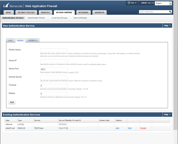 From the Authentication Service field, select a Radius server, for example, Entrust IdentityGuard.
