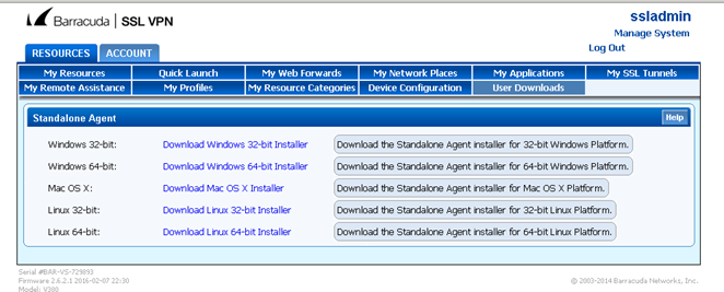 Click Manage Accounts > Resources > User Downloads and download the Client as per client platform and install it.