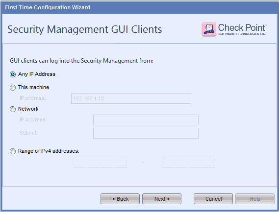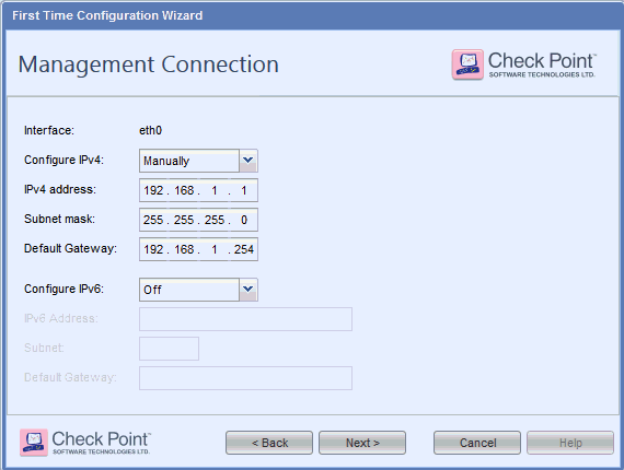 Check Point Security Gateway systems ship with a default network configured IP address of 192.168.1.1 on the management interface. You can access the web-based configuration utility through the management port, and configure the unit directly. If the default IP address is unsuitable for your network, define an IP on an administrative workstation in the same IP network as the Checkpoint system. Once the utility finishes and the system reboots, these default IP addresses are replaced with the information that you entered in the First Time Configuration Wizard.