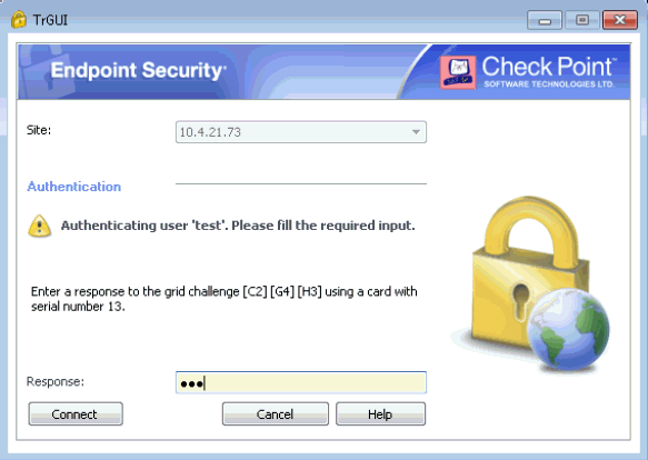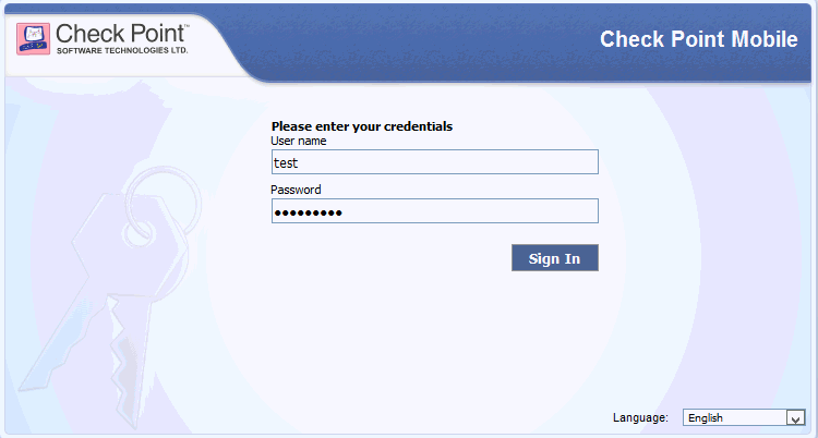 In the log in window, in the User name and Password fields, enter the user name that you have defined in Check Point and Identity as a Service in the section Creating a user.