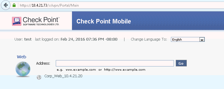 https:// <IP Check Point FW External Address>/sslvpn i.e. https://10.4.21.73/sslvpn