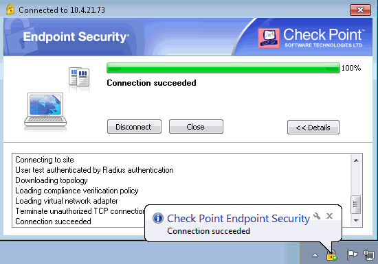 The user has authenticated successfully and the Check Point Mobile window appears.