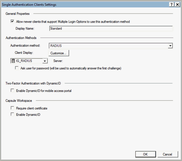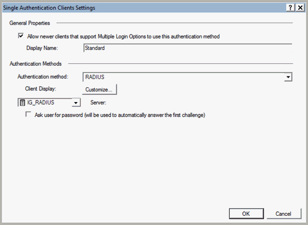 Select Token OTP Only, Password with second-factor, or No first-factor as the Authentication Type. This setting defines the level of authentication required to access a RADIUS application that relies on a gateway RADIUS agent configured before release 3.1.
