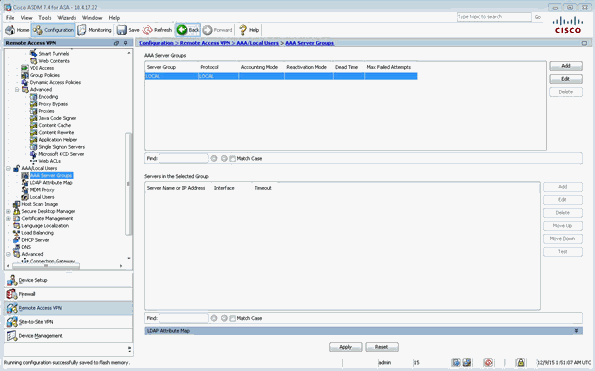 In the Configuration > Remote Access VPN tree menu, expand AAA Local Users Setup and select AAA Server Groups. The AAA Servers Group page appears.