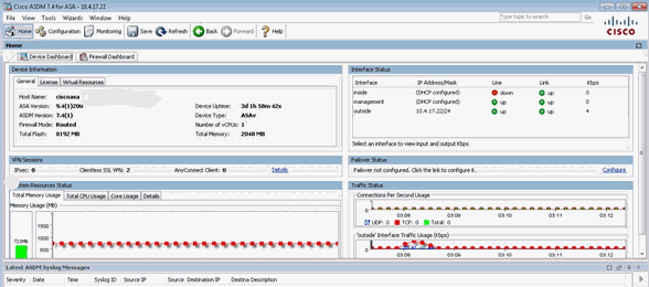 Log into the Cisco ASDM Version 7.4(1) or later. The Cisco ASDM home page appears.