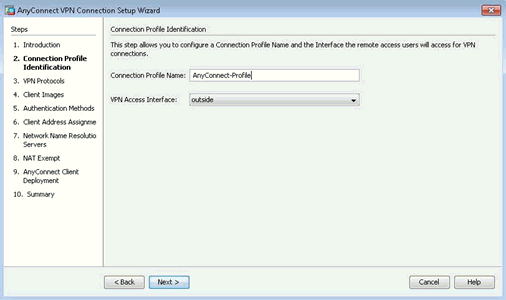 In the Connection Profile Name field, enter a name for your connection profile name, for example, AnyConnect-Profile.
