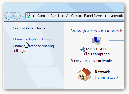 In the Network and Sharing Center, click Change adapter settings.