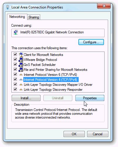 In the Local Area Connection Properties page, highlight Internet Protocol Version 4 (TCP/IPv4) and then click Properties.