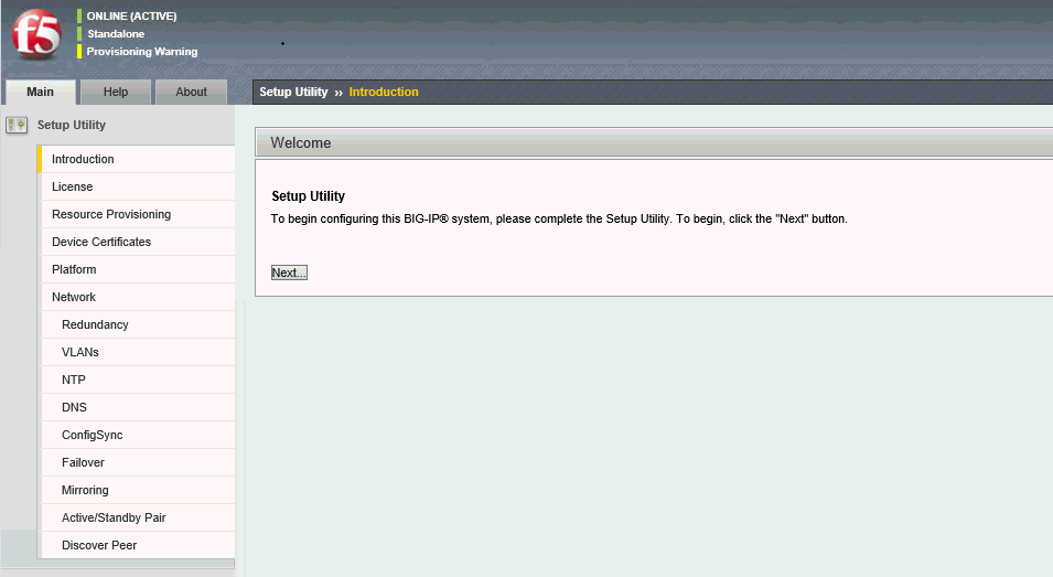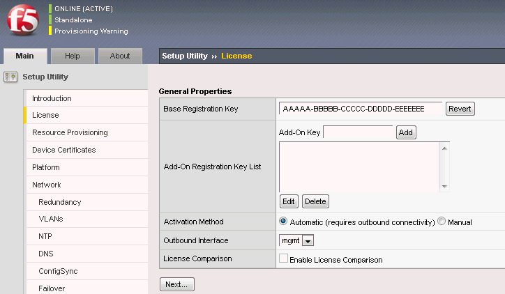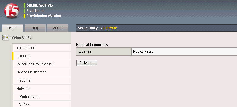 Before you begin, be sure to have the F5 BIG-IP base registration key. Using the Setup utility, you can activate the license and provision the F5 BIG-IP system. After you get the management workstation connected to the management interface, you can open the Configuration utility and begin licensing the system. When you start the utility from a Web browser, you use the selected default IP address as the application URL.