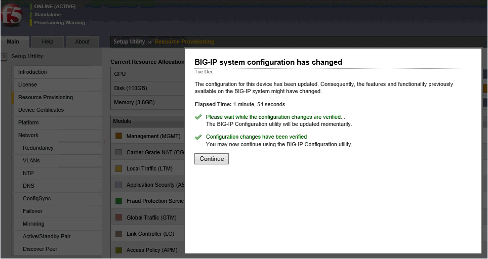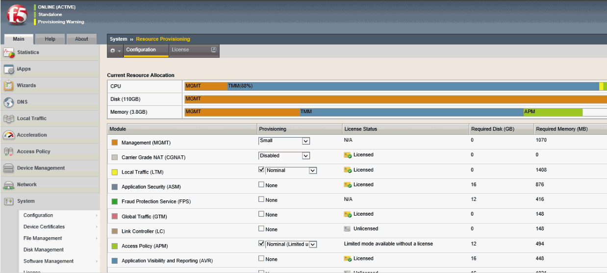 After the license is activated and the BIG-IP configuration is reloaded, the Resource Provisioning page appears.