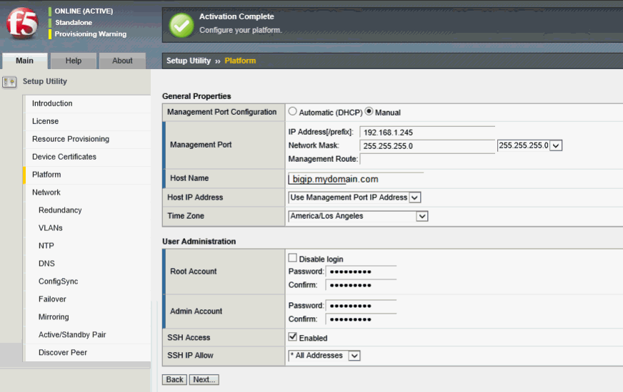 The F5 BIG-IP system license is now activated, and the F5 BIG-IP APM module is provisioned. The Standard network configuration screen within the Setup utility appears.