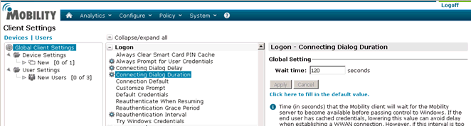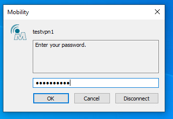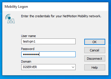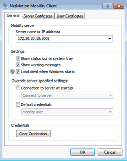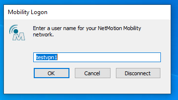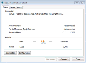 Go to the client machine and open the NetMotion client. The NetMotion Mobility Client page appears.