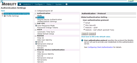 Under Authentication - Protocol, select RADIUS – EAP (PEAP and EAP-TLS). This is the correct option if you are using EAP GTC or MSCHAP-V2.
