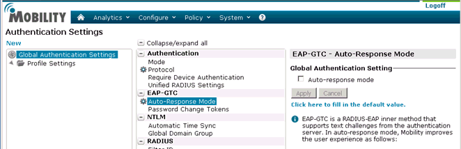 Select Authentication > EAP-GTC > Auto-Response Mode.