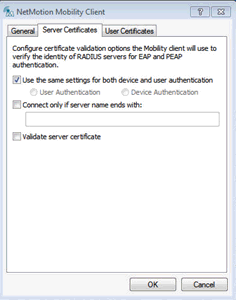 If you are using a server certificate for Identity as a Service, and the NetMotion client is set to validate server certificates, then you must install the self-signed or CA certificate used to issue the SSL server certificate on the NetMotion client machine.