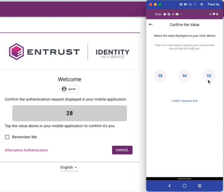 Mutual authentication requires that both IDaaS and your Entrust Identity app recognize each other. If mutual authentication is necessary to access your application protected by IDaaS, when you log in to IDaaS you see a challenge that you must match on your Entrust Identity app (as shown in the figure below).