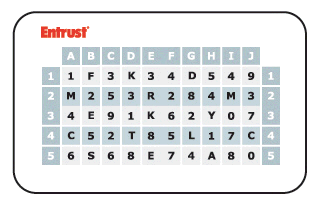 Grid authentication uses cards with a grid as the authentication lookup tool. When asked to authenticate with a grid, the challenge presents you with coordinates, for example, B3, H1. You reference the challenge coordinates on your grid card and respond by typing the corresponding values. For example, using the sample grid card shown below, the correct response to the challenge, B3, H1 is E 5.